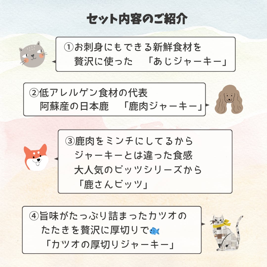 人気の高いお肉とお魚のジャーキーをセットにしています。